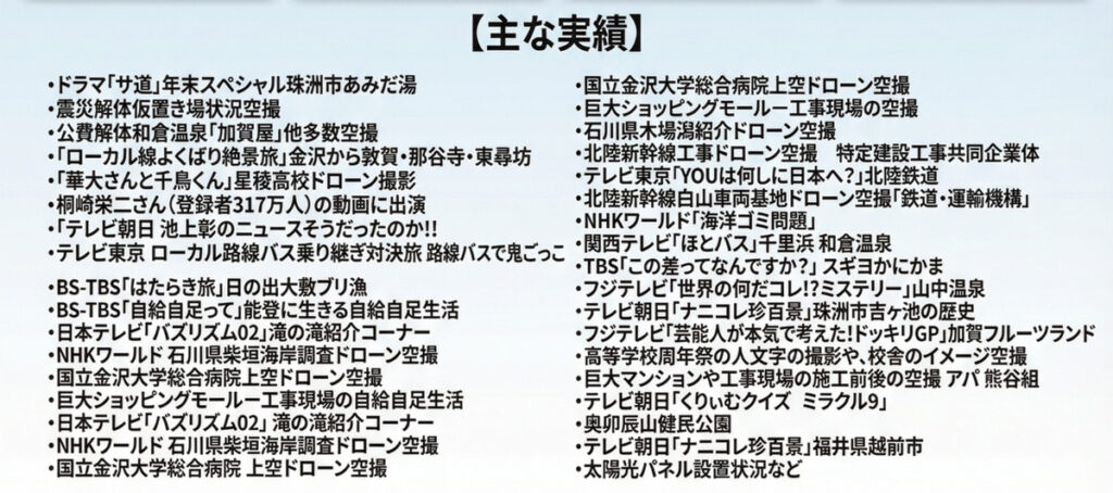 大手ゼネコンの建造物空撮、北陸新幹線工事現場、鉄道・運輸機構の広報映像など、提供分野は多岐にわたります。
